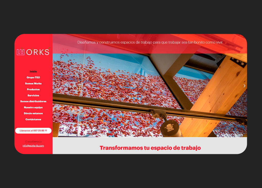 Con la estructura de navegación ya definida en la primera web, se continuó con la linea estética, trabajando en los copys para orientar el contenido a clientes del sector y mejorando la visibilidad de imagenes de espacios de trabajo.